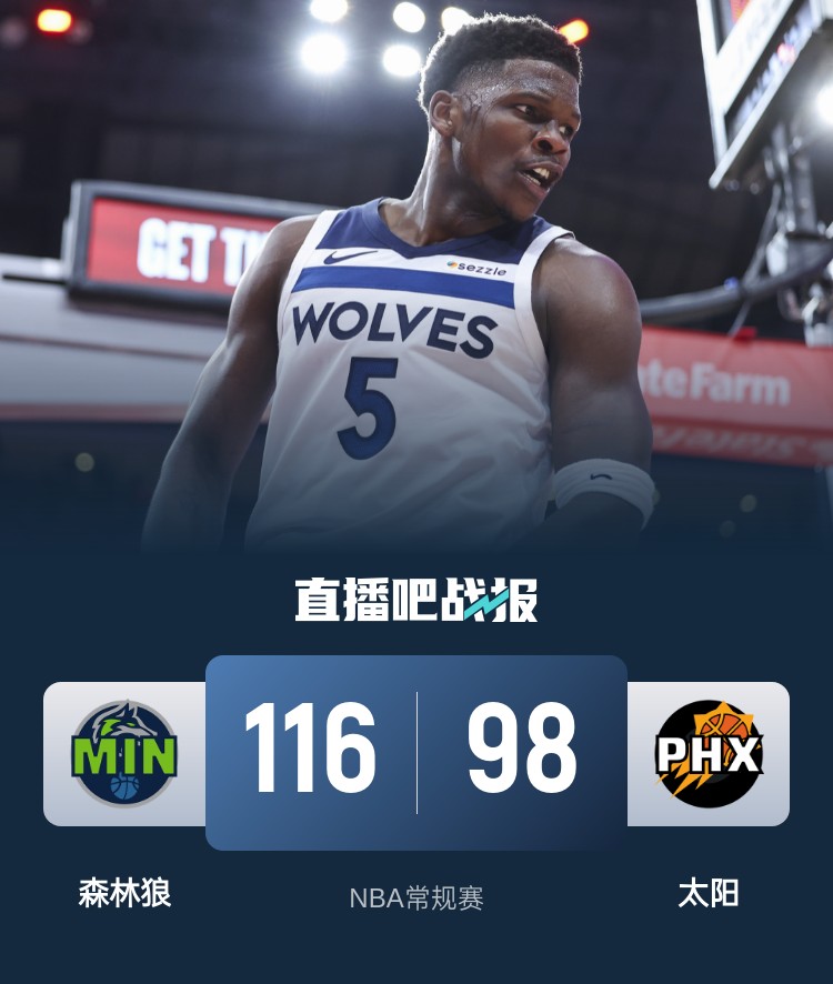 首节开局布克早早进入状态前4次出手全中并带领球队取得21-9的完美开局;不过森林狼在后半段迅速回暖,迪文岑佐连着两记三分加上爱德华兹和兰德尔的双核抢分,森林狼稳住局势迅速追上比分;次节太阳状态走低,这一节仅拿到首节一半得分,不过森林狼的发挥也一般靠着迪文岑佐最后的三分追至2分进入下半场。休息归来爱德华兹迎来爆发送上单节17分的表现,迪文岑佐则在外线命中三记三分,在两人的带动下森林狼一举扭转局势,末节森林狼顶住压力一直保持着两位数优势和太阳周旋,爱德华兹最后一记三分外加连续制造犯规两次拿到两罚一掷杀死比赛。最终,森林狼客场射落太阳完成赛季三杀。