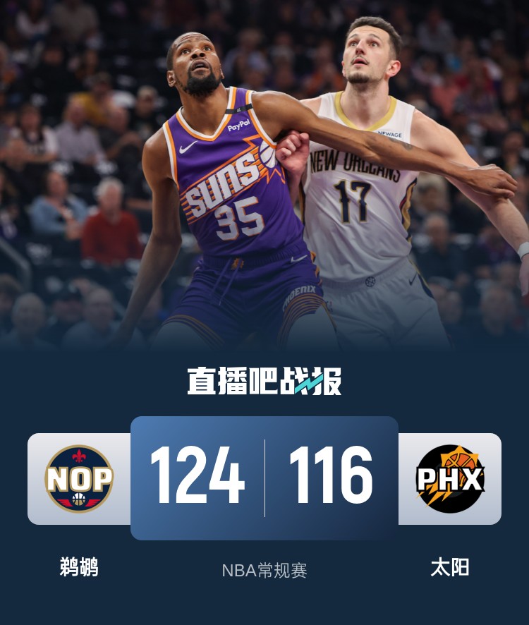 比赛开始,双方开场大打对攻,锡安得分助攻一肩挑,布克和杜兰特联手拿分给出回应,墨菲频频外线开火,次节鹈鹕命中率下降,布克穿针引线,波尔高效发挥帮助太阳迫近比分并完成反超,半场战罢太阳62-61领先鹈鹕。易边再战,两队继续缠斗,比分始终紧咬,锡安全面发挥,杜兰特和布克稳定输出还以颜色,末节双方争夺陷入白热化,关键时刻鹈鹕内外开花确立8分优势,太阳苦苦追赶无果。最终,鹈鹕124-116击败太阳,送给对手3连败。