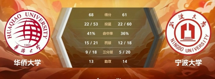 末节比赛,姜贺命中三分帮助华侨大学重新将分差拉开到两位数,之后的比赛宁波大学虽然一直将分差咬住在个位数,但始终无法获得反超的机会,最终华侨大学力克宁波大学。