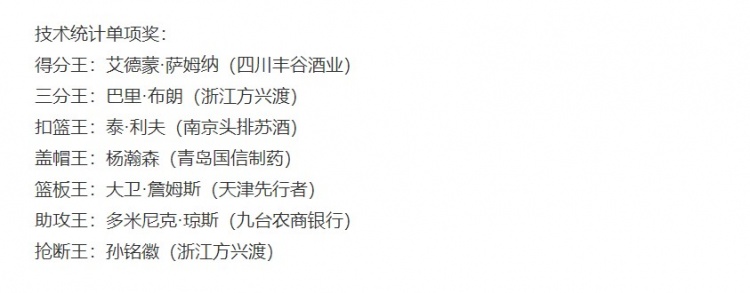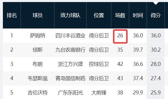 值得一提的是,在联赛官方公布的数据里,本赛季得分王是四川外援萨姆纳,而不是吉林外援琼斯,虽然萨姆纳的出战场次未达到30场。
