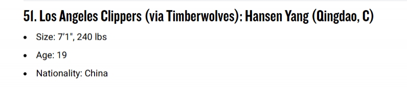 04月23日讯 Bleacher Report选秀专家Jonathan Wasserman今日更新了2025年模拟选秀榜单,其中中国男篮新星、青岛队中锋杨瀚森次轮总第51顺位被快船选中。上周,ESPN选秀专家Jonathan Givony曾报道,经纪公司Klutch Sports宣布,杨瀚森将参加今年NBA选秀。