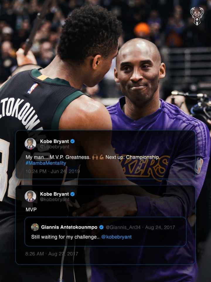 2017年,科比在推特上给一众NBA球星给予自己的挑战,字母哥也发推称“正在等待我的挑战内容”,科比回复:“MVP!”