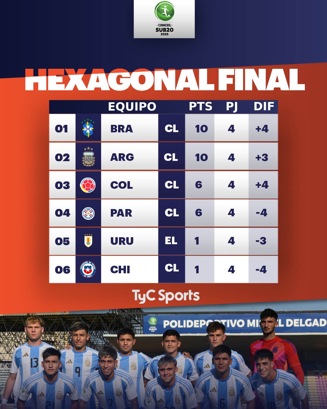 目前,巴西10分+4净胜球排名第一,阿根廷10分+3净胜球排名第二,哥伦比亚6分+4净胜球排名第三,巴拉圭6分-4净胜球排名第四,乌拉圭1分-3净胜球排名第五,智利1分-4净胜球排名第六,赛事冠军将在最后一轮决出。