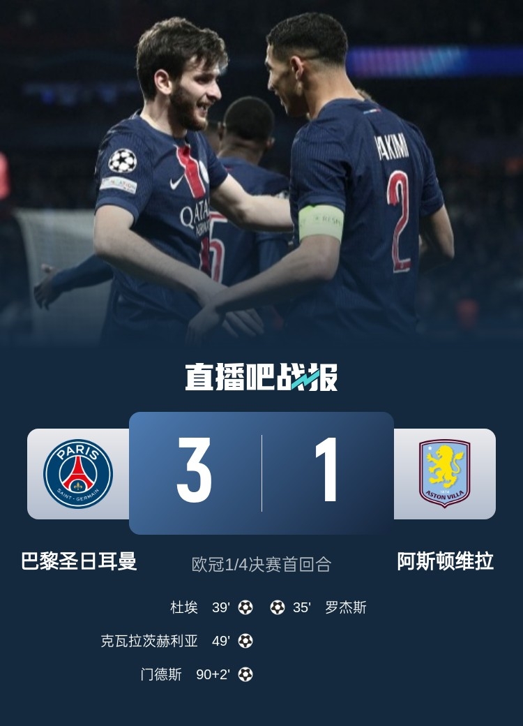 04月10日讯 欧冠1/4决赛巴黎3-1击败维拉,已经联赛夺冠的法甲霸主正冲击赛季三冠王。