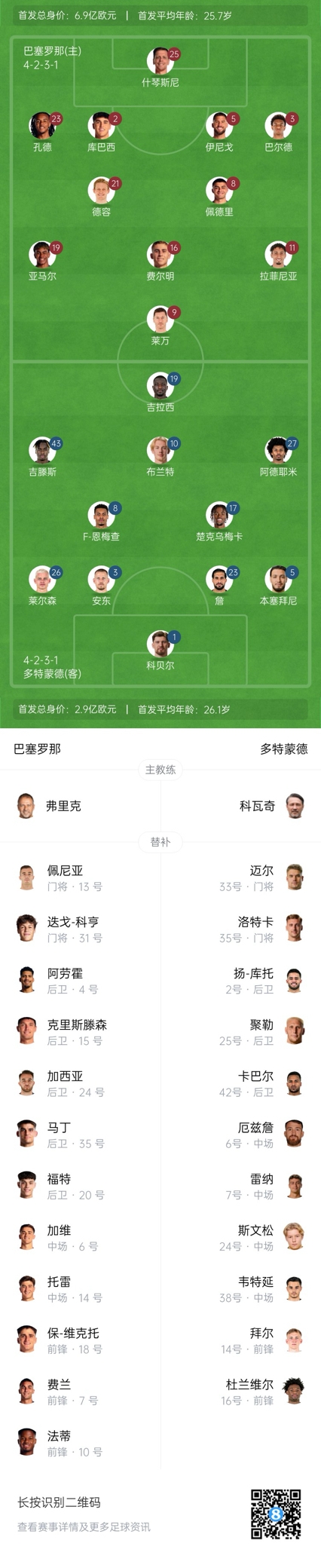 巴萨首发:25-什琴斯尼、2-库巴西、3-巴尔德、5-伊尼戈-马丁内斯、23-孔德、8-佩德里、16-费尔明、21-德容、11-拉菲尼亚、19-亚马尔、9-莱万