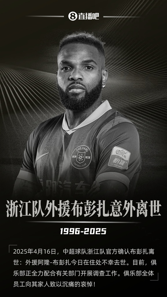 4月16日讯 今天晚间,浙江队官方宣布球队外援阿隆-布彭扎去世。自加盟球队以来,布彭扎为浙江队出场6次,贡献了4个进球和2个助攻,其中这4个进球是来自2次梅开二度。