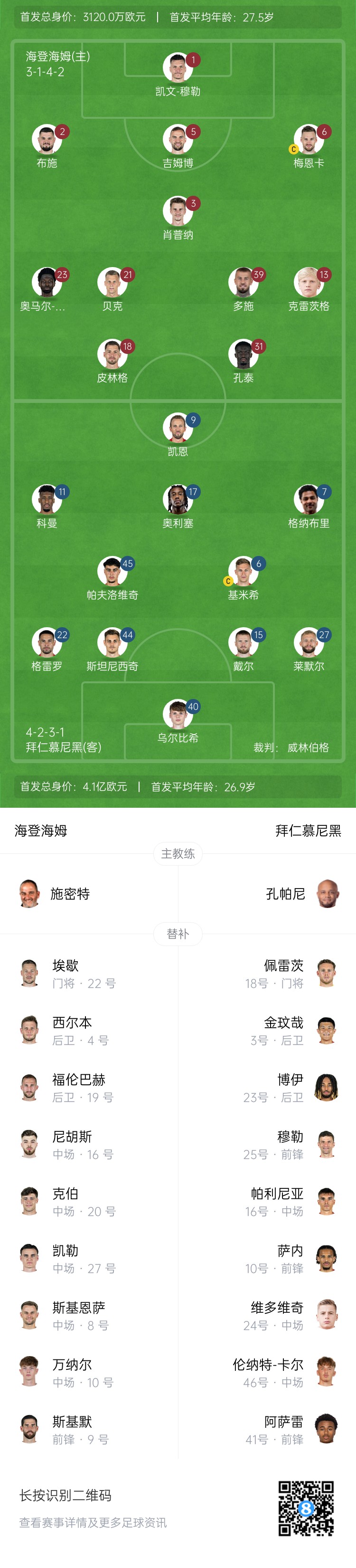海登海姆首发:1-凯文-穆勒、2-布施、6-帕特里克-梅恩卡、23-奥马尔-特劳雷、13-克拉齐希、3-扬-肖普纳、5-吉姆博、39-多施、21-阿德里安-贝克、18-马文-皮林格、31-康特