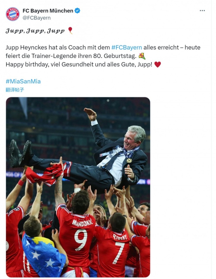 拜仁官方社媒晒出海因克斯的照片,并配文:“海因克斯作为拜仁主帅赢得了所有荣誉——今天这位传奇人物迎来了80岁生日。生日快乐,祝您身体健康,一切顺利,尤普(海因克斯)!”