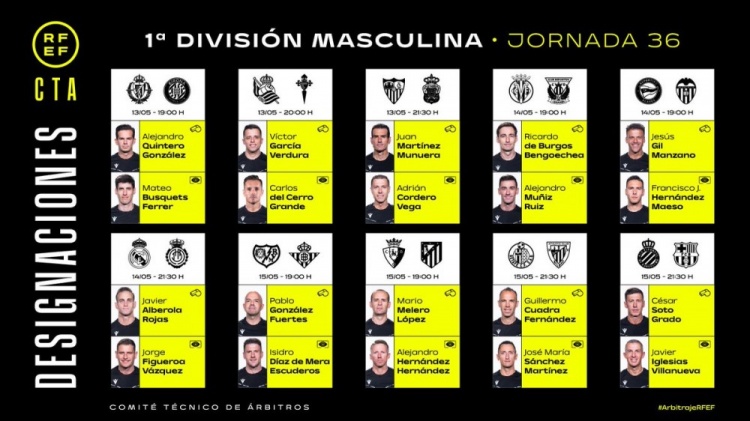 5月12日讯 西甲官方公布了第36轮比赛裁判安排,罗哈斯执法皇马vs马洛卡,格拉多执法西班牙人vs巴萨。