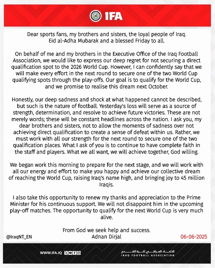 我代表伊拉克足协的同事们,对未能直接晋级2026年世界杯表示深深的遗憾。然而,我会充满信心地说,我们将在接下来的比赛中全力以赴,争取通过附加赛获得两个世界杯参赛名额之一。我们的目标是晋级世界杯,我们承诺在十月实现这一梦想。