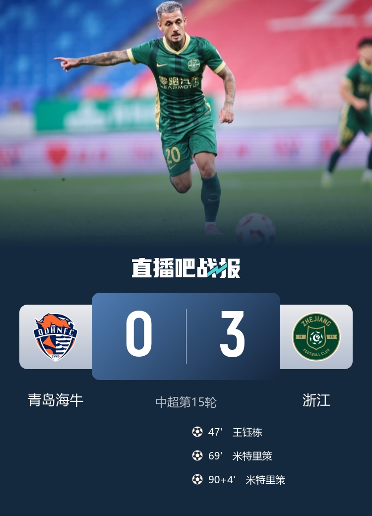 6月25日讯 北京时间6月25日晚上19:00,中超第15轮,青岛海牛坐镇青岛青春足球场迎战浙江。上半场,王钰栋造险,牟鹏飞神扑,奥古斯托伤退。下半场,米特里策首秀助攻王钰栋贴地斩闪击,王钰栋伤退,米特里策梅开二度。全场结束,青岛海牛0-3浙江。本场过后,青岛海牛积8分继续排名倒数第二,浙江积20分暂升第7。