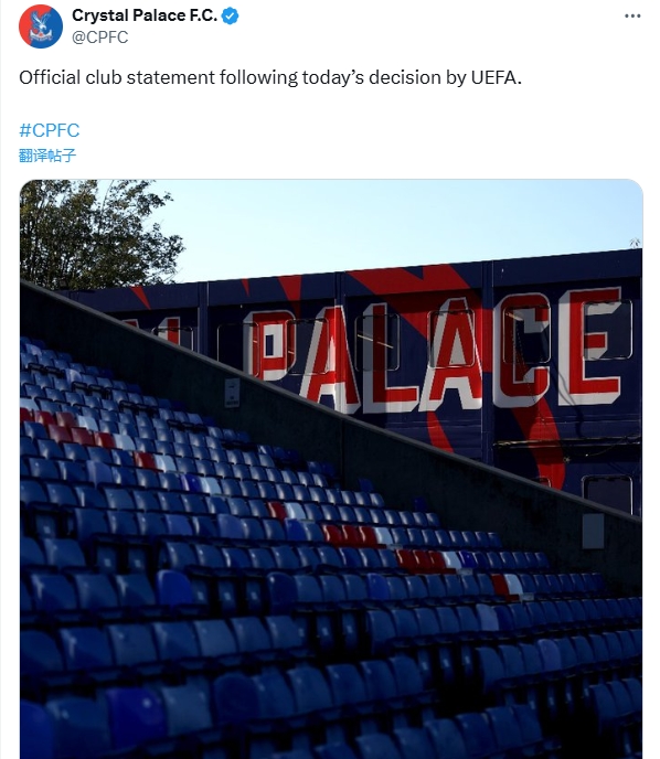 水晶宫足球俱乐部对欧足联(UEFA)决定取消我们的欧联杯参赛资格感到极度失望。