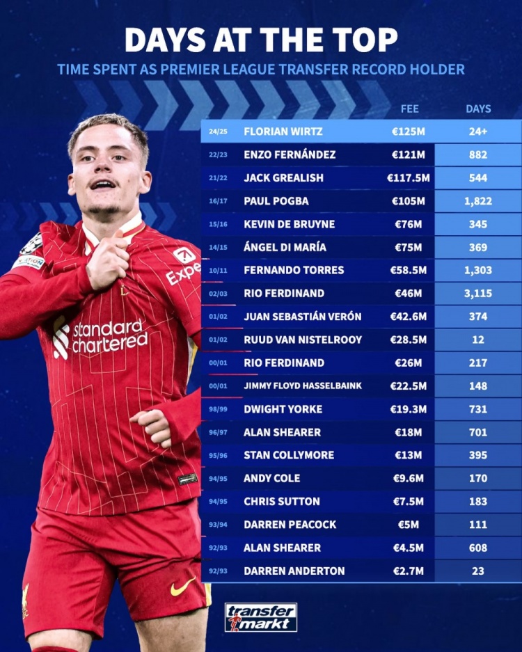 7月26日讯 德国转会市场列出了英超历史标王的保持时间,其中费迪南德4600万欧保持3115天最长,目前的标王为维尔茨,他的转会费为1.25亿欧元。