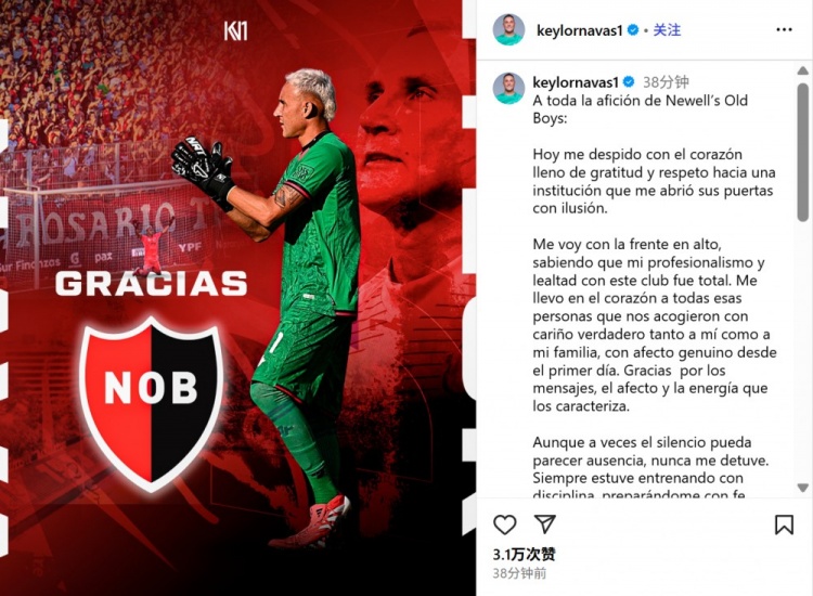 7月23日讯 38岁的前皇马门将纳瓦斯将转会墨西哥美洲狮,他也在今日通过社媒发文告别纽维尔老男孩: